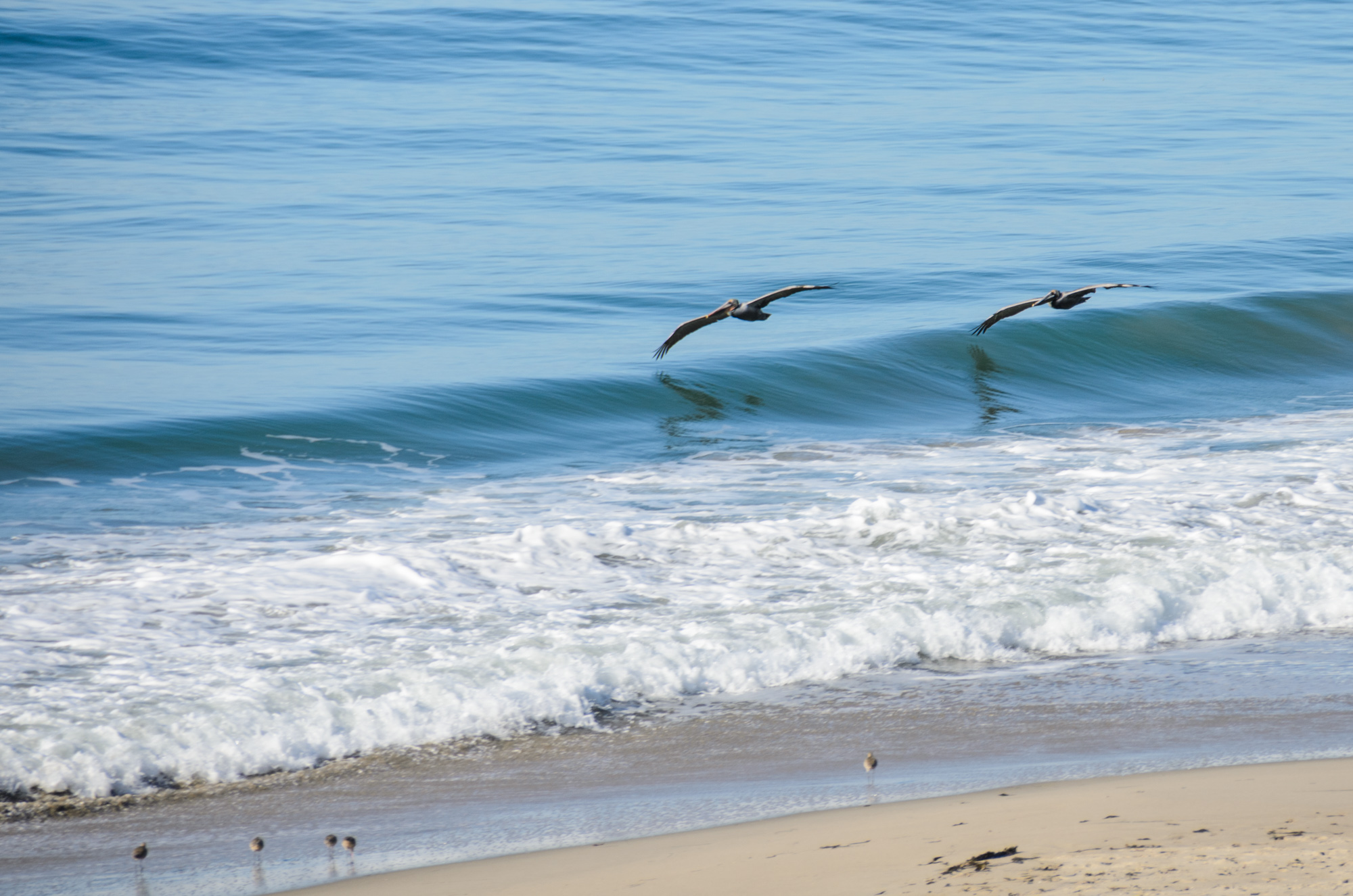 I’m always impressed at how close pelicans skim to the surface of the sea, no matter how many waves there are.